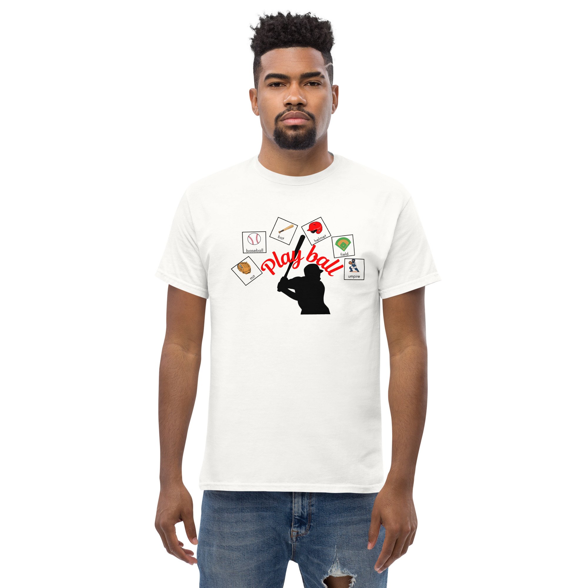 The shirt features a bold silhouette of a baseball player holding a bat, positioned at the center of the design to capture the spirit of the game. Surrounding the silhouette are the words “Play Ball” in a dynamic, sporty font that curves around the figure, creating a sense of motion and energy. To add visual interest and tie into a communication-friendly concept, the design incorporates PECS-style icons of baseball-themed items, such as a glove, ball, cap, bat, and base, arranged neatly around the silhouette. These icons not only highlight key elements of the sport but also make the design more engaging, approachable, and versatile for fans of all ages. The overall look balances athletic energy with playful visuals, making it ideal for team events, school programs, or community baseball celebrations.